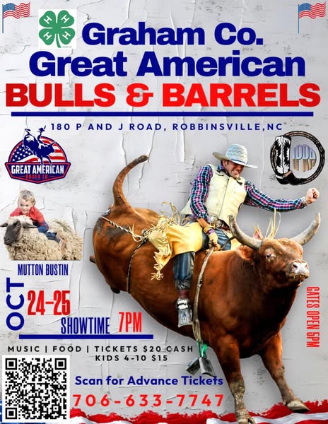 Oct 24 Graham Co. Great American Bulls & Barrels October 24, 2025 @ 5:00 pm - October 25, 2025 @ 10:00 pm Outdoor Arena 180 P and J Road, ROBBINSVILLE Event Details Get Directions