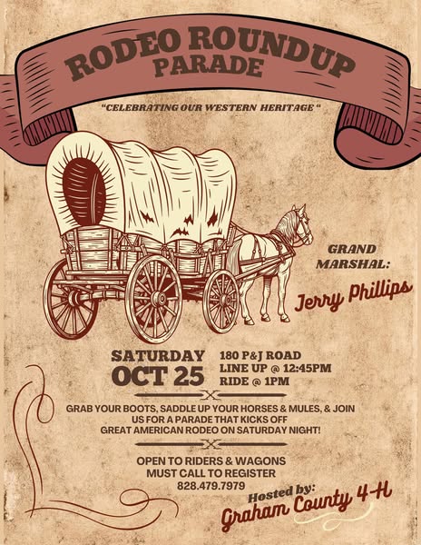 Oct 25 Rodeo Roundup Parade 1:00 pm Outdoor Arena 180 P and J Road, ROBBINSVILLE Event Details Get Directions